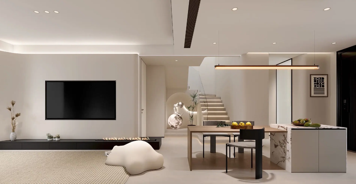 在生活态度中汲取一份自由交互的精神共享,最终化为了家的形态。纵横场域之势,将公区设置尽量开放自由且可视化,与私区进行界面一线分隔与联动,演绎不同场景之间的自由交互。在场景与情感的双向联动中,释放艺术、自然、生活的无限可能。