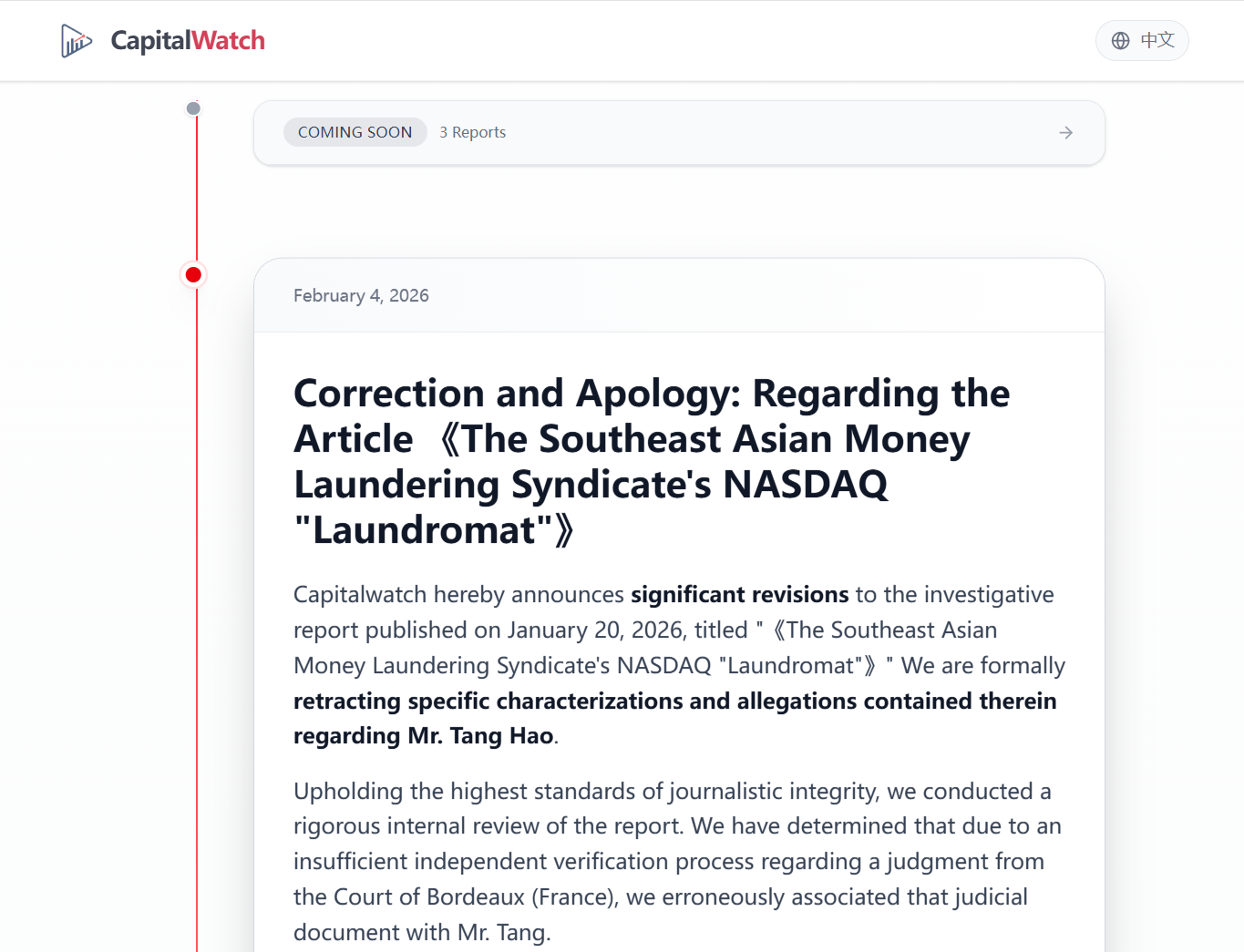 Capitalwatch在声明中表示,该媒体秉持对新闻事实的敬畏标准,已对《东南亚洗钱集团的纳斯达克「洗白机」》开展严格内部复核,核查发现报道存在两处关键事实性偏差。其一,在引用法国波尔多法院判决书时,因身份比对环节的独立核查不足,错误将该司法文书与唐浩先生建立关联;其二,文中关于唐浩先生与陈志、太子集团、金贝集团、唐军、仰智慧等人存在直接关系的描述存在错误,相关内容未能达到该媒体多重非匿名信源交叉验证的刊发要求。